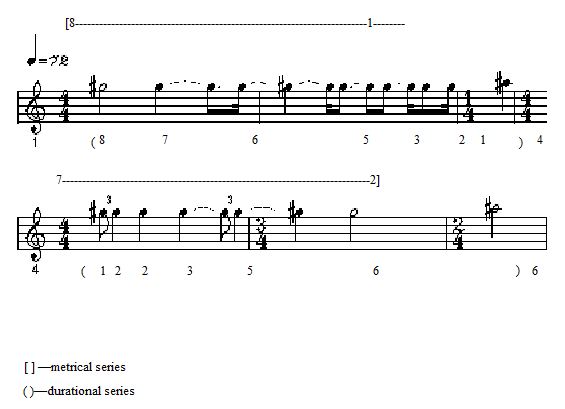 In addition to these metrical patterns, Vivier also creates small-scale structures using durational series. These series also occupy prominent positions, especially at the opening of the piece, where several of them occur. The first rhythmic gesture of the piece is built on a series of durations in which each successive duration is shorter than its predecessor by one sixteenth note. Immediately following this is an ascending series in which each successive duration is larger by an eighth note triplet (with some fudging, necessary to make the durations fit the metre). These ascending and descending rhythmic gestures occur within the context of the interlaced metrical structure mentioned above (ex. 4). It was noted that in this case the metrical structure was audible. This is made clear in ex. 9, which gives the melody for the first six measures of this section. In each of the two subphrases, the goal of the subphrase occurs in the measure corresponding to the ascending metrical series. This is both the melodic goal of the subphrase, and the goal of the durational series, i.e., the duration required to complete the descending series in the first subphrase (four sixteenth notes), and the maximal duration of the ascending series of the second subphrase (six eighth note triplets).