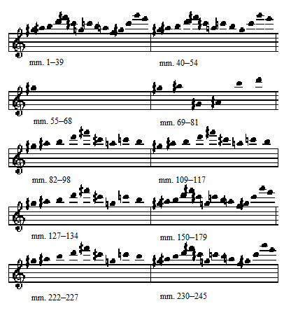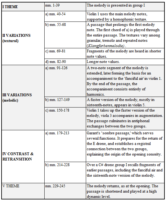 The work as a whole is divided into sections, with clear textural changes marking the divisions. Each section, as Garant notes, has some form of the melody through it. There is one notable exception, Garant's "grave and sombre passage." The melody is always in the highest register, usually played by violin 1. But the melody is not always given the preferential treatment it receives at the beginning and end of the work, at which points it dominates the texture. At other times, the melody is woven into the texture, or covered with more active material, as it is in Garant's "fanciful air." Furthermore, the entire source set is not exhausted in each section; sometimes only a few of the pitches are used, in one case, only a single source pitch is used. Given that each section is rather single-minded and closed, and since the work opens with a clear, thematic statement of a melody that is subsequently transformed throughout the piece, it is possible to view the work as a kind of theme and variations. I would not want to push this characterization of the piece too hard, especially since Vivier himself included none of the usual trappings of variation sets (e.g., numbering the variations) but it does help to convey an overall sense of the work's form. Ex. 2 (see appendix for longer examples) provides a summary reading of the piece as a set of variations. Ex. 3 outlines the melodic use of the source set throughout the work.