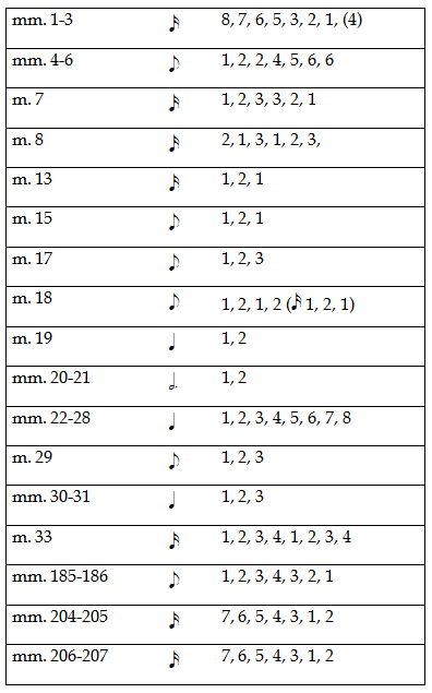 Throughout the piece Vivier creates similar gestures using ascending, descending, palindrome and interlaced (e.g., 4, 1, 3, 2) series. Again, these constructs are not employed in a systematic or algorithmic way, they are simply a part of Vivier's rhythmic language, used freely. These are summarized in ex. 10. These patterns do, however, have a significance on the interpretation of rhythm in Vivier's music (as well as many other twentieth century composers). Figures that appear to be 'syncopated' or 'complex' often turn out to be quite simple in conception. The idea of syncopation is based on a system of normative sub-accents within the measure. Given Vivier's manner of constructing rhythms, it would be wrong to try to infer a system of sub-accents. The downbeat, however, retains its normal accentual role. Many cases of suppressed downbeats are actually instances in which the measure in question is a subdivision of a larger metrical unit. For an example of this we need look no further than m. 2. In this case, the operative metre is 8/4, which Vivier has divided in two for simplicity's sake.