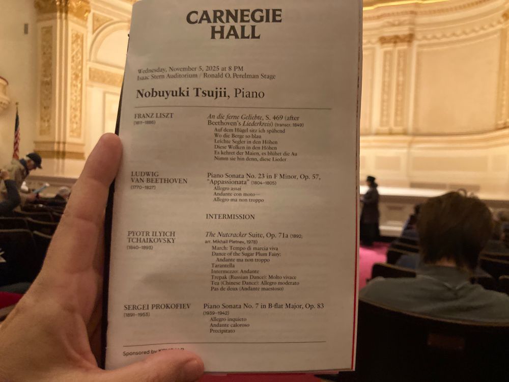 The centerpiece of the first half was Beethoven’s Appassionata, which Tsujii played forcefully. I was a little taken aback in the first movement, when the pianist let the left hand overpower the right hand melody in the second theme group, in ab minor (the parallel minor of the relative major!), which is otherwise a favorite little tune in this work. I think that was maybe my only quibble in the entire concert. (I did have a quibble with the guy sitting across the aisle from me letting his phone go off right at the end of the first movement of the Appassionata, but that’s another story.)