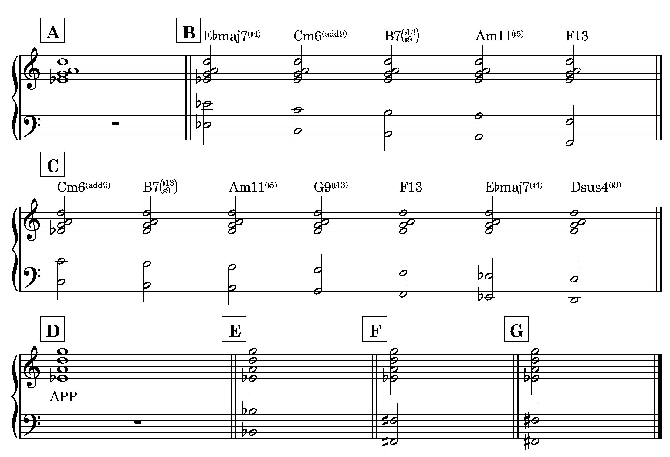 If we look at the major scale, we see that the APP is on the 4th degree of the scale. Keeping Eb as the bass note, that would mean our new scale is Bb major. Bb major has only one note different from C melodic minor: the Bb itself. That means the chord with Bb as the root is a new one, the other six notes are the same as chords we have already discovered. This new chord is shown in example [E]. I didn’t label this chord, but you could think of it as EbMaj7#4/Bb or Bb13sus. We are now up to eight chords.