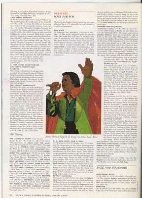 As the New Yorker informs us every week, "Musicians and night-club proprietors lead complicated lives; it's desirable to call ahead to confirm engagements." Looking at BB King's website, it seems Eartha Kitt will do the New Year's Eve show instead. (And if your eyesight is really good, you can see who we're catching tonight at BB's.)