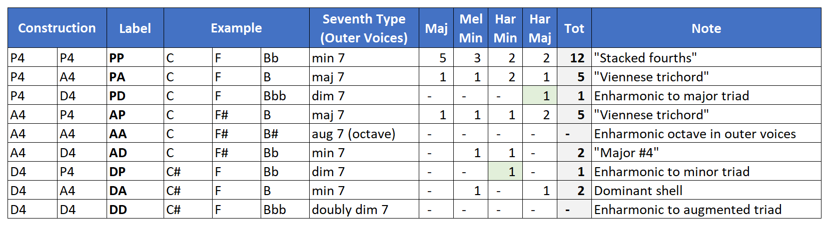 Two of the trichords, AA and DD, do not appear in any of the harmonizations. In AA, the outer voices form an augmented seventh, which is enharmonically equivalent to an octave. In DD, the trichord is enharmonically equivalent to an augmented triad.