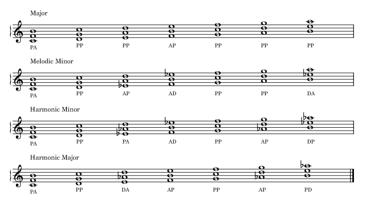 We saw yesterday that P was the most common dyad, and see now that PP is the most common trichord. It occurs five times in the Major harmonization, three times in the Melodic Minor, and two times in each of the Harmonic Minor and Harmonic Major. So then, just like the P dyad, the PP trichord is the most harmonically ambiguous of the quartal trichords.